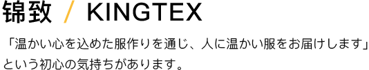 常に目指してきたことは「温かみのある服作りにより、生活向上に貢献すること」です。“錦致”は単なる貿易会社から貿易と生産まで出来る企業に転換し、更に貿易から生産、技術まで一貫して行える企業に進化しています。将来に向けて、“MADE IN CHINA2025”という方針を推進するのに伴い、高い技術を続々投入していき、少ない資産で利益を生み出すことを目的に効率の良い経営を目指して行きます。